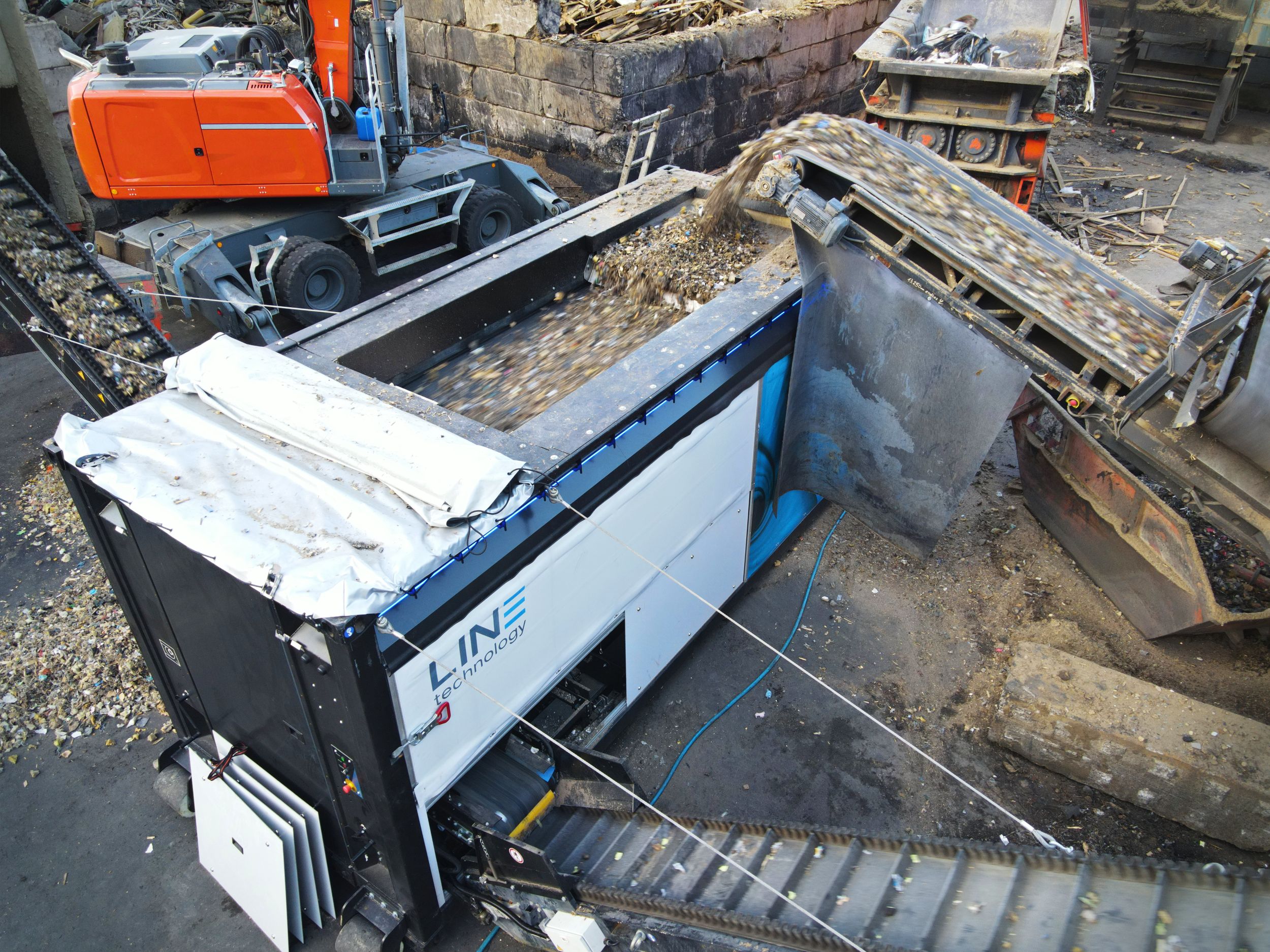 Neddeleren kan nemt kombineres med en modulopbygget sorteringsenhed fra Blueline Technology, hvis der er behov for højere sorteringsgrad eller frasortering af specifikke materialer. Systemet er containerbaseret, let at flytte mellem projekter og kan udstyres med fx magnetudskiller, sensorer eller vindsigte – alt efter opgavens krav.
