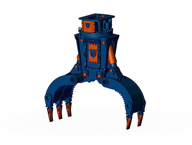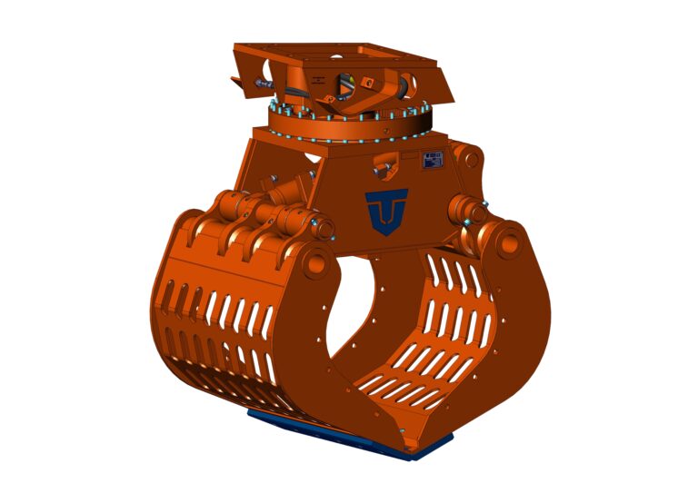 De særlige robuste ribber (kan efter kundeønske også leveres med brændte skovle til anvendelse ved omlastningsopgaver) er ekstremt vridningsstive og bæredygtige. Den stabile, dobbelt lejrede drejekrans forsynes af en indvendig hydraulikmotor, som ved hjælp af chokventiler er beskyttet mod overtryk. Slanger er beskyttet af et smalt slangeføringsrør.